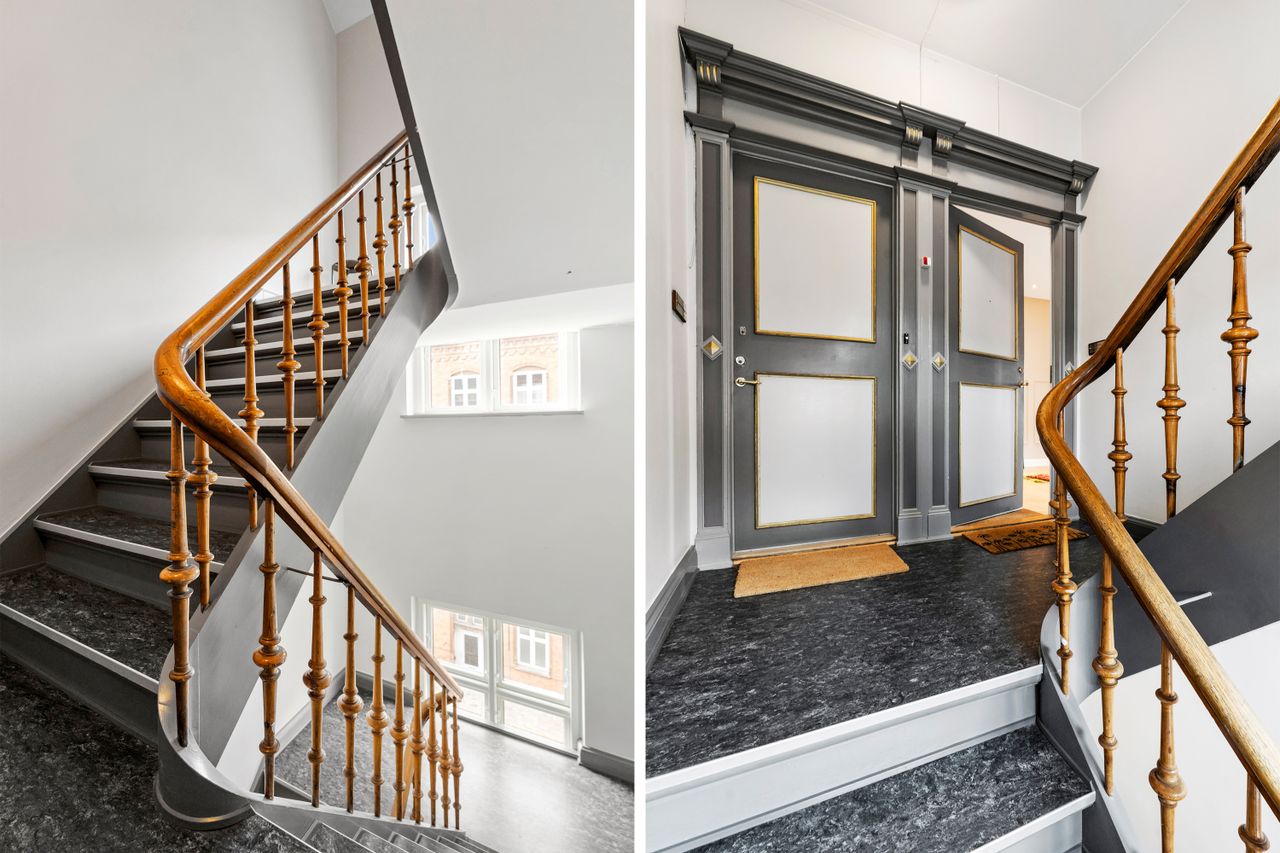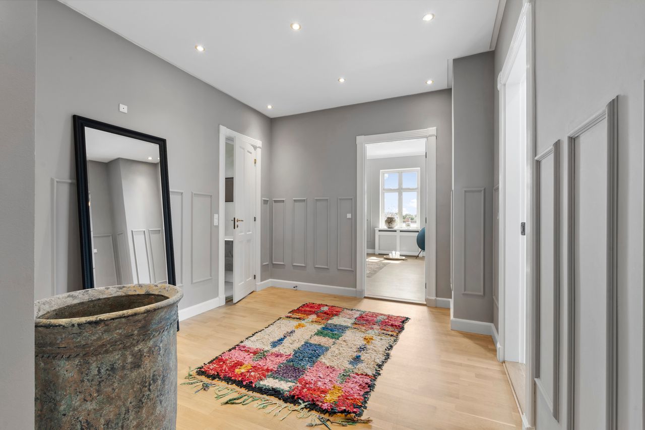 Materialevalget og løsningerne medvirker til at skabe en rød tråd igennem den 252 kvadratmeter store lejlighed både etagemæssigt og på tværs af etagerne. I vil således bemærke, at begge badeværelser er renoveret med mikrocement og udstyret med samme type armaturer, ligesom det er et gennemgående træk, at væggene er spartlede og malet i smagfulde nuancer. Desuden er gulvbelægningen af samme type. Gennemtænkt. Stilsikkert. Smukt. Ring endelig til os, hvis I vil se boligen med jeres egne øjne, for så får vi også mulighed for selv at se den en gang mere.