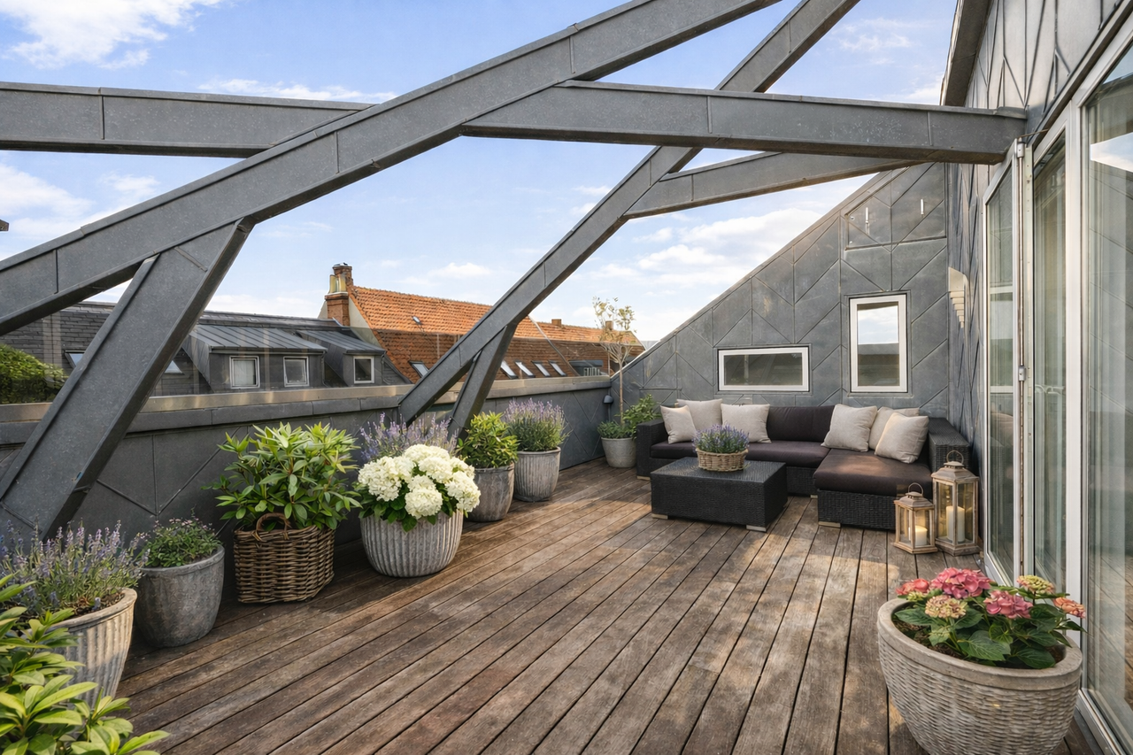 Heroppe skinner solen naturligvis ikke altid, men når den gør, er det en spot så pragtfuld, at den burde være fast inventar på forsiden af alverdens livsstilsmagasiner om det gode liv. Pladsen på tagterrassen er så rigelig, at I kan dyrke egne tomater og andre gode sager i jeres helt private urban gardening-projekt, uden det behøver gå ud over pladsen til stole og borde. I har det hele her. Luksus af en anden verden, midt i byen, oppe på toppen.