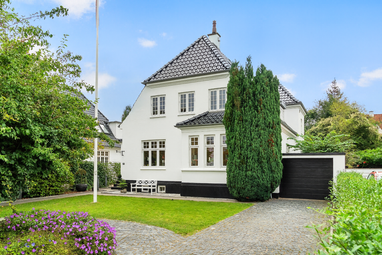Ejendommen er opført i 1916 i en klassisk byggestil med en høj attraktionsværdi og er i indkørslen udsmykket med chaussesten i et elegant mønster, hvilket medvirker til at skabe et særdeles indbydende ankomstparti, der matcher den kridhvide facade og det gnistrende sorte tag på fornem vis. I indkørslen er der mulighed for at parkere flere biler, mens garagen kan rumme en mindre bil, en motorcykel eller jeres cykler og barnevogne. Bagtil er grunden et superhyggeligt uderum med blandt andet en pergola fra 2020, hvor der er indbygget lys og varme, ligesom lamellerne kan reguleres elektronisk. Desuden er der fine legemuligheder, en pæn plæne og et stykke vild-med-vilje have.